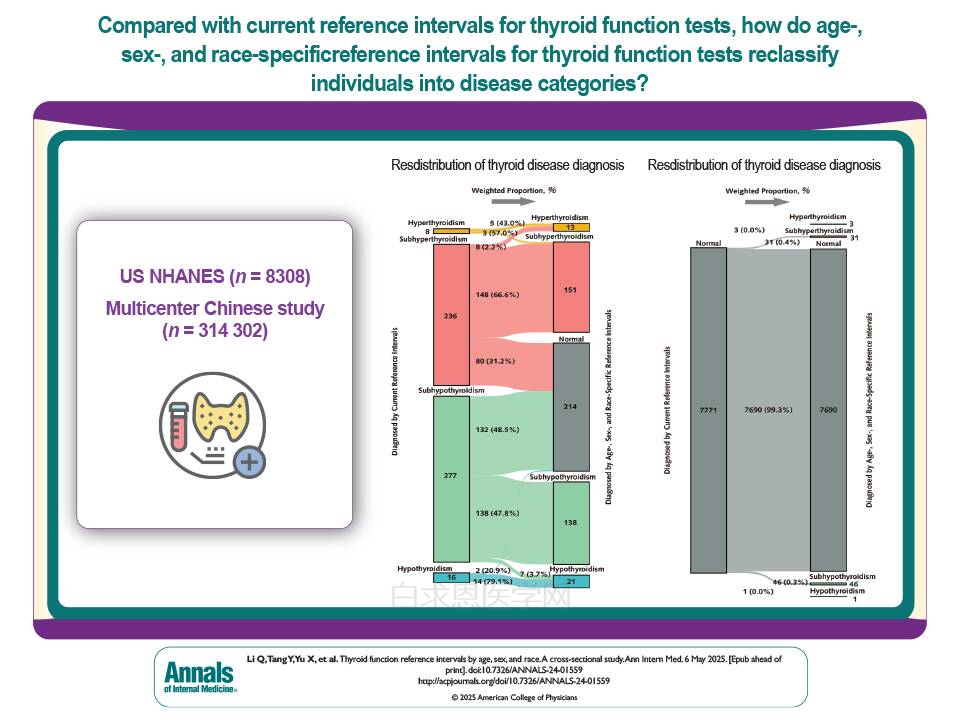 当使用更具体的年龄、性别和种族特异性参考区间时,美国数据集中48.5%最初诊断为亚临床甲减个体被重新分类为正常,同时31.2%最初诊断为的亚临床甲亢个体也被重新分类为正常。相似地,在中国数据集中,73.5%最初诊断为亚临床甲减个体被重新分类为正常,而亚临床甲亢受影响很小。因此,使用当前统一参考范围进行甲状腺功能检测可能导致部分成人被误诊。该研究结果对当前甲状腺疾病管理现状提供了新的见解。更个性化的参考范围可以提高诊断甲状腺疾病的准确性,从而减少传统诊断标准下潜在的过度治疗,从而优化患者诊疗方案。
