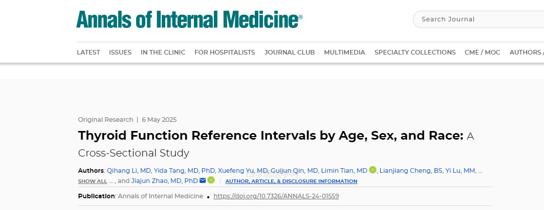 山东第一医科大学附属省立医院赵家军团队联合国内49家医疗单位在甲状腺疾病诊断研究方面取得进展。相关成果以“按年龄、性别和种族划分的甲状腺功能参考区间:一项横断面研究(Thyroid Function Reference Intervals by Age, Sex, and Race:A Cross-Sectional Study)”为题,于2025年5月6日发表于《内科学年鉴》(Annals Of Internal Medicine)杂志,论文链接: