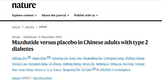 这一发现为2型糖尿病的临床治疗提供了重要策略。研究成果以“Mazdutide versus placebo in Chinese adults with type 2 diabetes”为题,在12月17日发表于国际顶级期刊Nature。